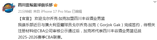 北京时间12月22日,根据四川男篮官方社媒公示,我俱乐部近日与澳大利亚籍球员戈尔乔克·加克(Gorjok Gak)完成签约,待相关注册材料经CBA公司审核公示通过后,加克将代表四川丰谷酒业男篮征战2025-2026赛季CBA联赛。
