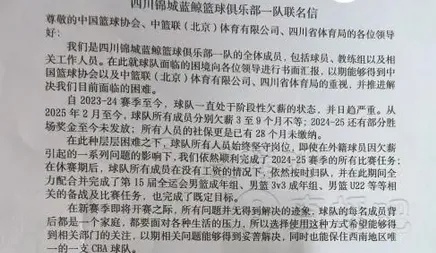 联名信中,四川男篮全体成员表示他们遭遇欠薪3至9个月不等,且有部分奖金未发放,社保更是有28个月未交!