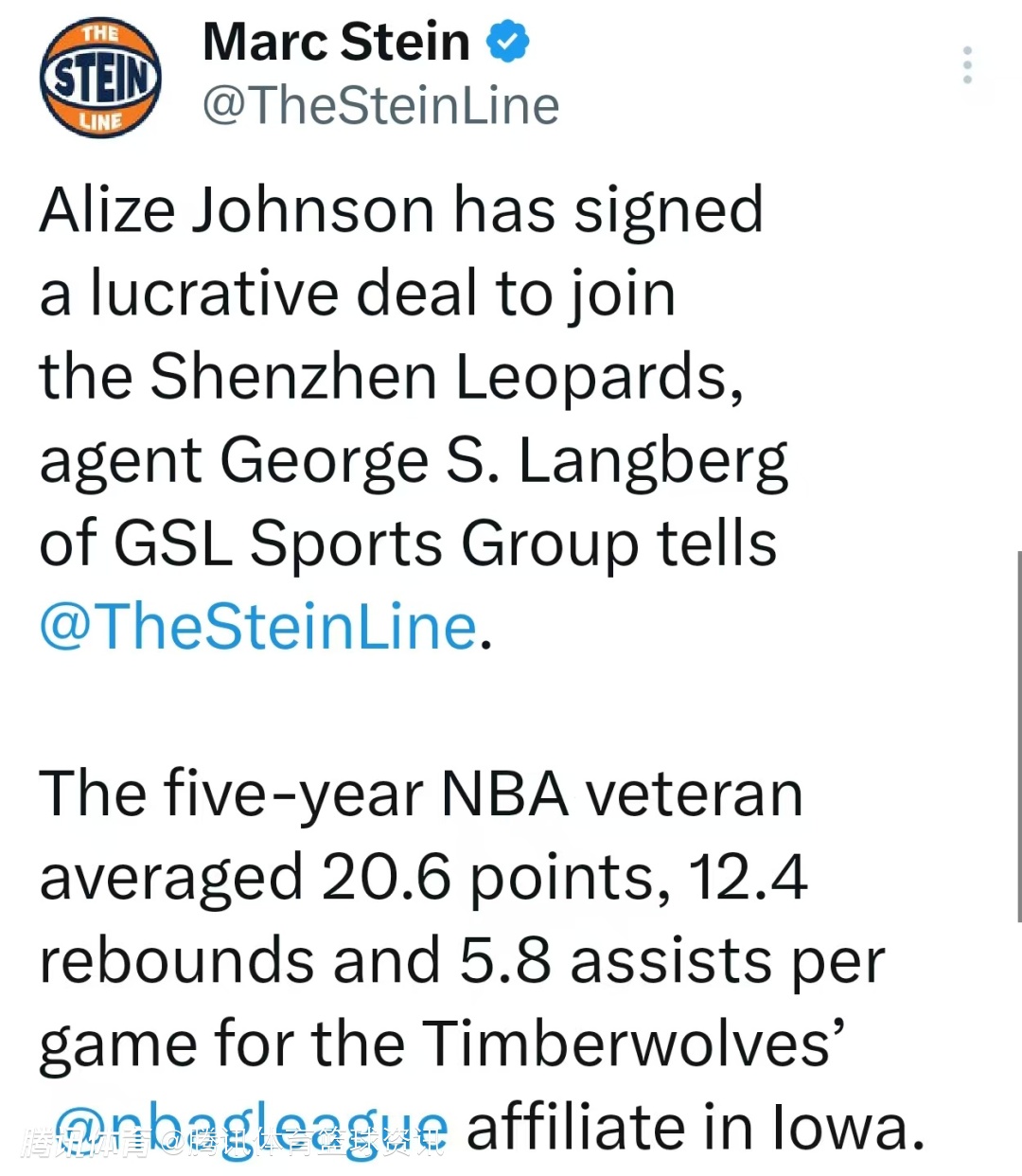 北京时间2月11日,据名记Marc Stein报道,阿利兹-约翰逊已与CBA深圳队签下一份高薪合同。