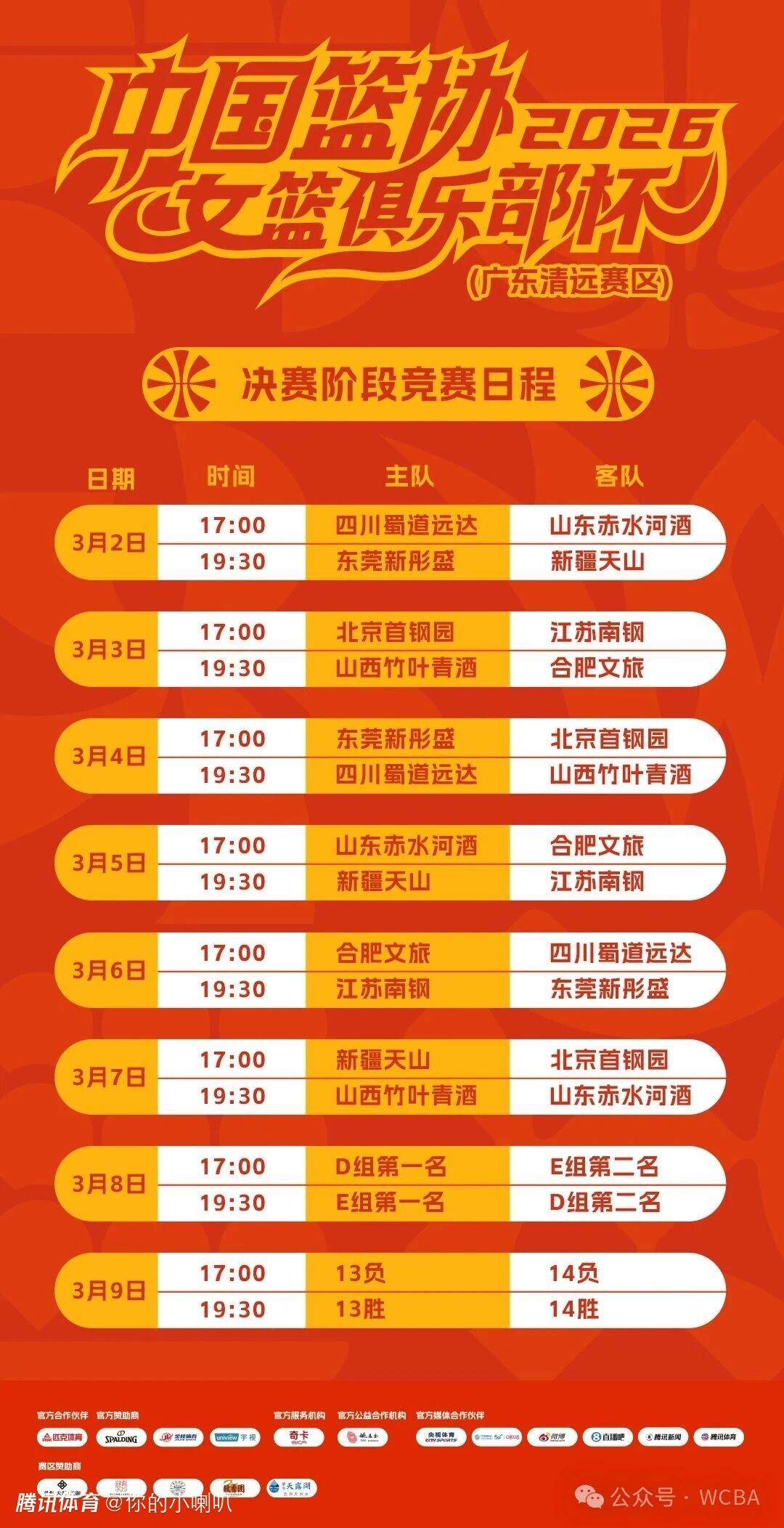 根据竞赛规程,晋级的八支球队将依据预赛阶段跨组名次进行蛇形排列,落位于D、E两个小组。决赛阶段将于3月2日至9日在广东清远赛区打响,各组前两名晋级半决赛,直至决出最终冠军归属。