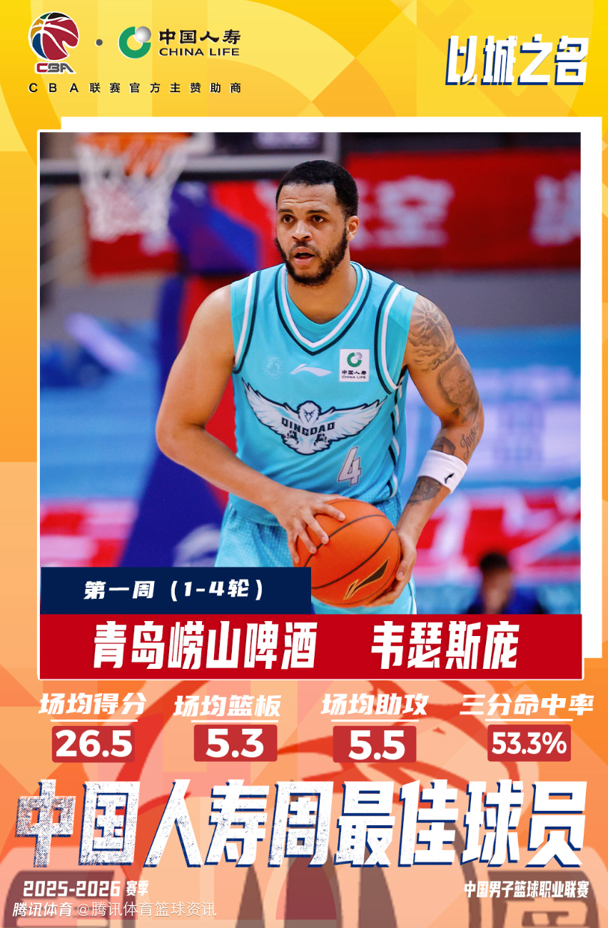 【韦瑟斯庞当选2025-2026赛季CBA联赛常规赛第一周中国人寿周最佳球员】韦瑟斯庞本周出战4场比赛,率领青岛国信海天篮球俱乐部取得其中3场比赛的胜利,在他场均出战21分钟的时间里可以得到26.5分、5.3篮板和5.5助攻,投篮命中率超过六成。在对阵南京天之蓝的比赛中,韦瑟斯庞得到56分、6篮板、6助攻的数据率队取得开季三连胜。