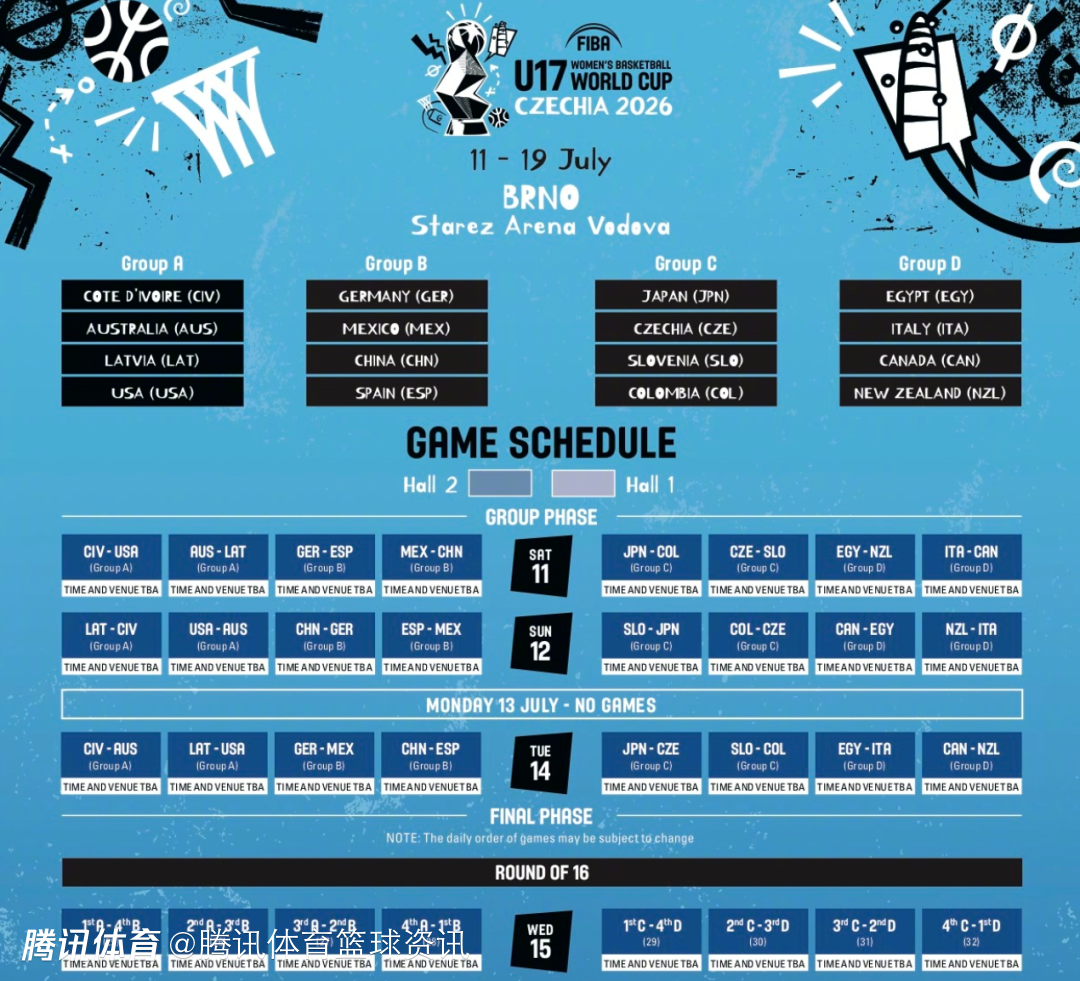 2026年U17女篮世界杯将于7月11日-19日在捷克布尔诺举行。