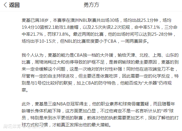 “此外,麦基是三座NBA总冠军得主,他的职业素养和球商毋庸置疑,而且随着年龄增长身体机能下降,这方面更加凸显,不过他肯定不是一名言听计从的‘乖’球员,特别是来到水平更低的联赛,教练对他的执教需要更加艺术,深刻了解他的打球方式和习惯,才能真正发挥出他的最大潜能。”