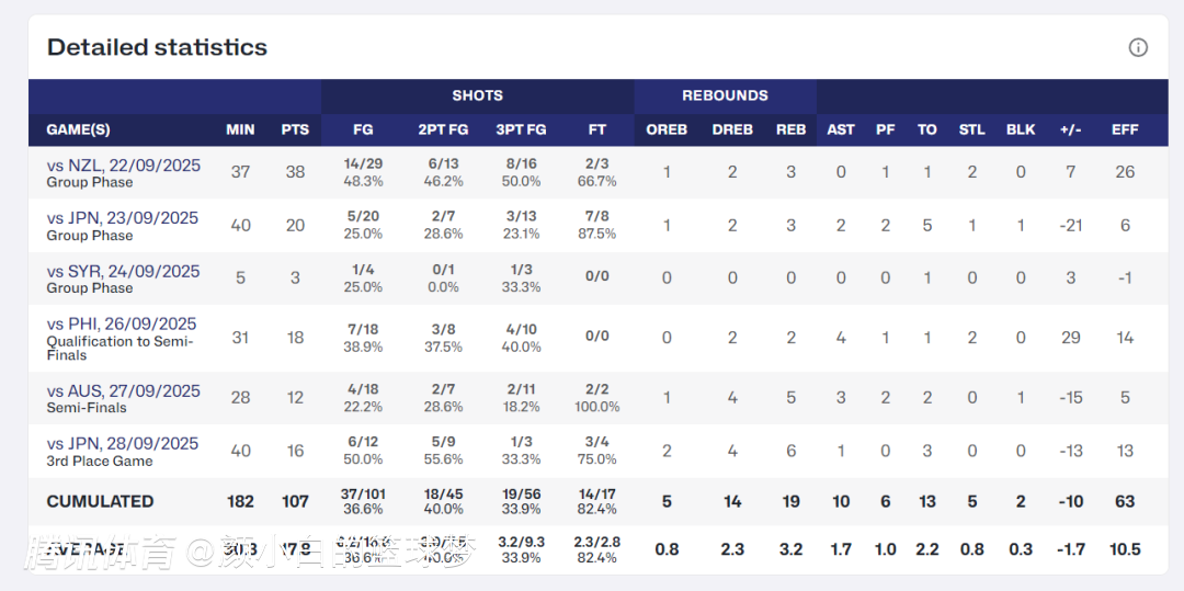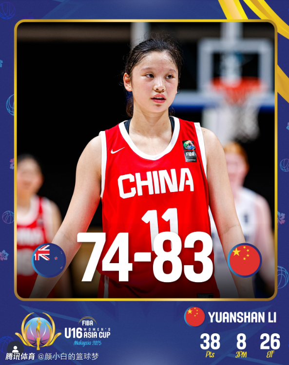 去年U16女篮亚洲杯的第一场比赛,李沅珊就打出单场38分创造国少纪录,她在面对新西兰的比赛中独扛一队,全场比赛36分钟,29中14,三分16中8,拿到38分3篮板0助攻2抢断仅1失误,命中率48.3%,三分命中率50%,得分占比超过全队45%。