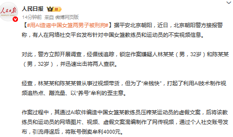 作案过程中,其通过AI软件编造中国女篮某教练员压榨某运动员的虚假文案,后将该教练员和运动员的网络图片、视频、虚假文案混编制作了网传视频,通过个人社交账号发布,引流得逞后,将账号倒卖牟利4000元。