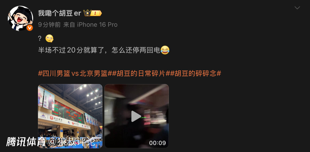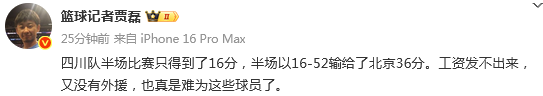 篮球记者贾磊发文:四川队半场比赛只得到了16分,半场以16-52输给了北京36分。工资发不出来,又没有外援,也真是难为这些球员了。