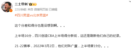根据媒体人“三土带刺”发文点评:“上半场16分,四川创造CBA上半场得分新低,这还是刷新他们自己的纪录。 21-22赛季,2022年3月2日,他们对阵广厦,上半场曾19分。”