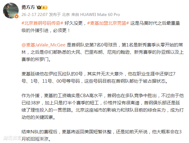 “作为外援,麦基的工资确实是CBA高水平,首钢也在多队竞争中胜出,”该媒体人说。