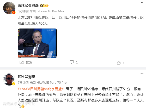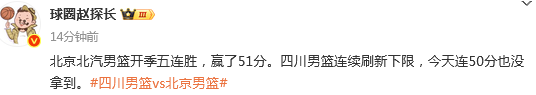 媒体人“刘骁”发文点评:“看了一场四川VS北京,最终四川输了51分,没有外援,加上赛季前的变故,这支球队能站在赛场上已经非常不容易了。然而,更让人感动的是四川球迷,球队这个状况,还能有那么多人去现场支持,值得一个大大的点赞”。