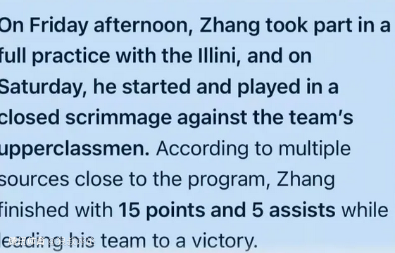 根据此前的美媒报道,张博源参加了伊利诺伊大学的全队合练;他作为首发,与校队高年级球员进行了一场封闭对抗赛。据多位接近球队的消息源透露,张博源砍下15分、送出5次助攻,并带领自己的队伍取得了胜利。