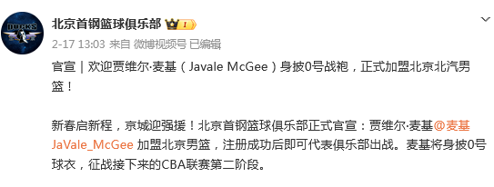 根据北京首钢官方社媒的公示,目前已经确定与前NBA冠军内线麦基达成一致,即将代表北京首钢征战下一个窗口期的比赛。