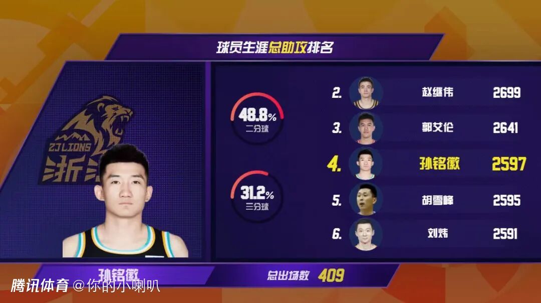 浙江方兴渡88-74山西汾酒的比赛中,浙江方兴渡球员孙铭徽上场17分28秒,得到5分并送出3次助攻,CBA生涯总助攻达到2597次,超越胡雪峰(2595次),升至CBA历史助攻榜第4位。