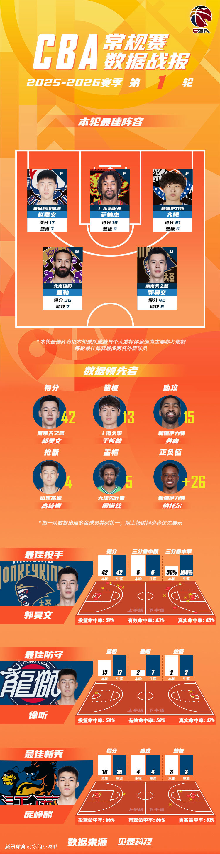 广东东阳光107-102战胜南京天之蓝的比赛中,南京天之蓝球员郭昊文上场37分10秒,得到42分、6个篮板和8次助攻,成为本轮比赛得分最高的球员。