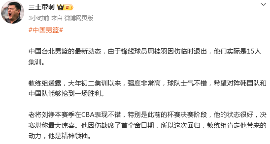 北京时间2月24日,根据中国台北媒体的报道,锋线球员周桂羽因伤临时退出,只有15人参加了集训。