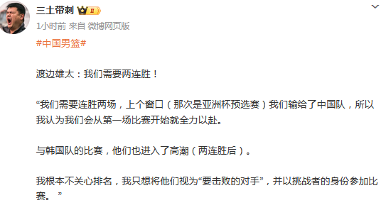 世预赛第二个窗口期,中国男篮对阵日本男篮将于2月26日正式开打,赛前,日本男篮核心渡边雄太接受媒体采访,谈到即将主场对阵中国男篮的话题。