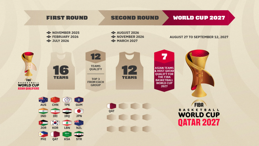 每支球队打完第二阶段的6场比赛后,每个小组的前3名、成绩最好的第4名,以及卡塔尔队(东道主球队),将获得 2027 年国际篮联篮球世界杯的参赛资格。