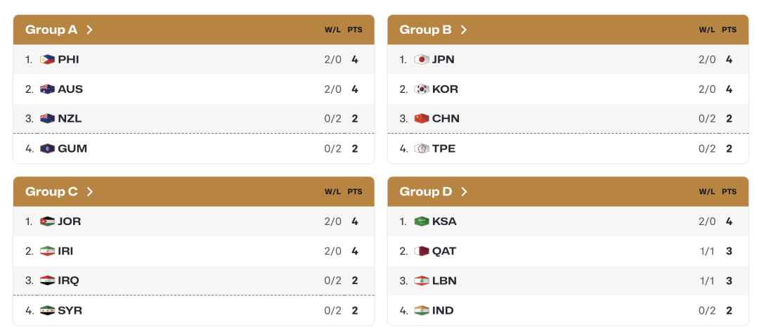 以下是目前亚大区四个小组积分情况,第一窗口期中国男篮两负韩国,排名小组第三,此次第二窗口期对阵日本、中国台北、今年夏天第三窗口期再战日本、中国台北,三个窗口期过后,中国男篮只要排名小组前三就可晋级第二阶段。当然,由于0胜2负开局,后面每场比赛男篮都要力争胜利,毕竟第一阶段战绩也会带入第二阶段,第二阶段6支球队一组,最终前三才能晋级世界杯正赛。