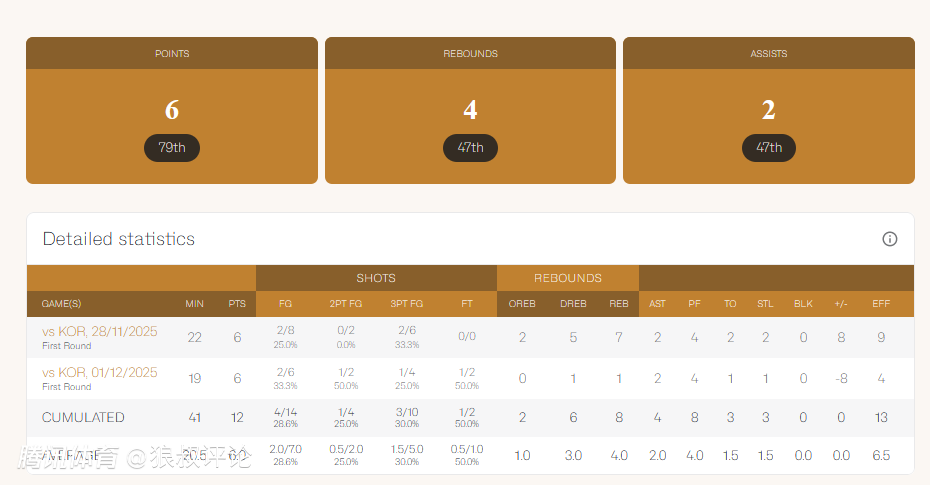 上一个窗口期,高诗岩代表中国男篮出战2场比赛,场均20.5分钟得到6分4篮板2助攻,投篮命中率为28.6%,三分球投篮命中率为30%。其中,在主场迎战韩国的比赛,高诗岩空篮不中引发过不少争议。