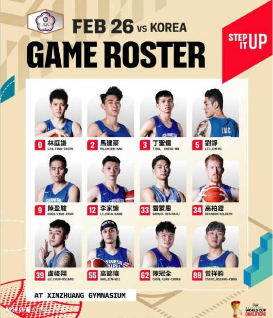 中国台北男篮对阵韩国男篮12人名单出炉: