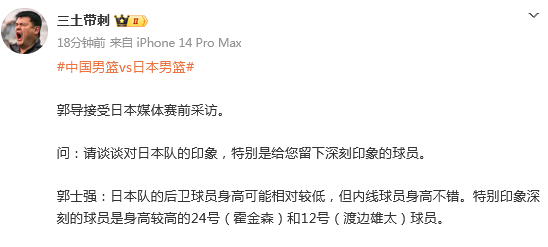 郭士强:日本队的后卫球员身高可能相对较低,但内线球员身高不错。特别印象深刻的球员是身高较高的24号(霍金森)和12号(渡边雄太)球员。