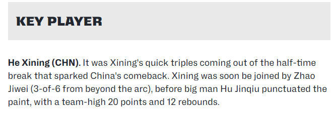 FIBA官网写道:“中场休息后,正是贺希宁连续的快速三分球点燃了中国队的反攻号角。赵继伟(三分球6投3中)很快加入火力输出,内线大将胡金秋则统治禁区,砍下全队最高的20分12篮板。”