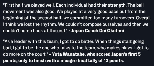 桶谷大表示:“上半场我们打得不错,每个人都发挥出了特点,球的转移、防守都很好,节奏也很棒。但从下半场一开始,我们失误太多,中国队的三分投得很好,他们在下半场反超了比分。总的来说,因为失误我们丢掉了节奏,没能稳住心态,最终没能追回来。比赛中我们一度追回比分,但中国队又命中三分。进攻端我们投篮不错,但防守端还有很多需要改进的地方。我们本想打出高质量的防守,但中国队一直领先到最后。”