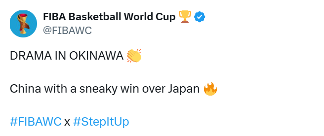 北京时间2月27日,2027年男篮世界杯亚洲区预选赛第二窗口期的焦点战昨晚在日本打响,中国男篮客场作战,在一度落后15分的不利局面下完成绝地反击,最终以87-80逆转击败日本男篮。赛后,国际篮联官方更新社交媒体,点评本场比赛:“冲绳的戏剧性时刻,中国男篮从日本偷走一场胜利!”