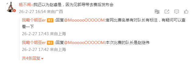当有网友表示“赵睿是队长啊”时,该媒体人回复:“本次比赛的队长是赵继伟。官网比赛名单对队长有标注,有疑问可以查看一下。”