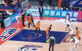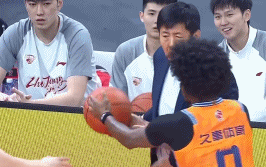 首节比赛还剩6分08秒,浙江队底线发球,球出界后被浙江男篮主教练丁伟拿到。此时,丁伟左手拿着篮球,右手对着场上的弟子比出了“5”的战术。