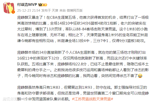 “五场比赛下来,庞峥麟场均22.8分,已经不止是最佳新秀,隐隐已成本土最犀利的得分手之一。之前我说他很多技巧运用和赛场神韵都让人看到了徐杰的影子,而今晚同时有徐杰和庞峥麟的比赛,我两边看,突然间觉得徐杰不香了。”该媒体人说。