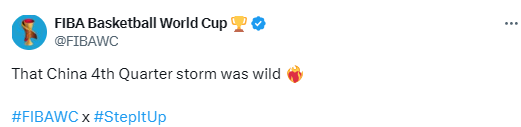 赛后,FIBA官方账号晒出本场比赛的过程走势图,并写道:“中国男篮在第四节打出的那波风暴真是太猛了!”
