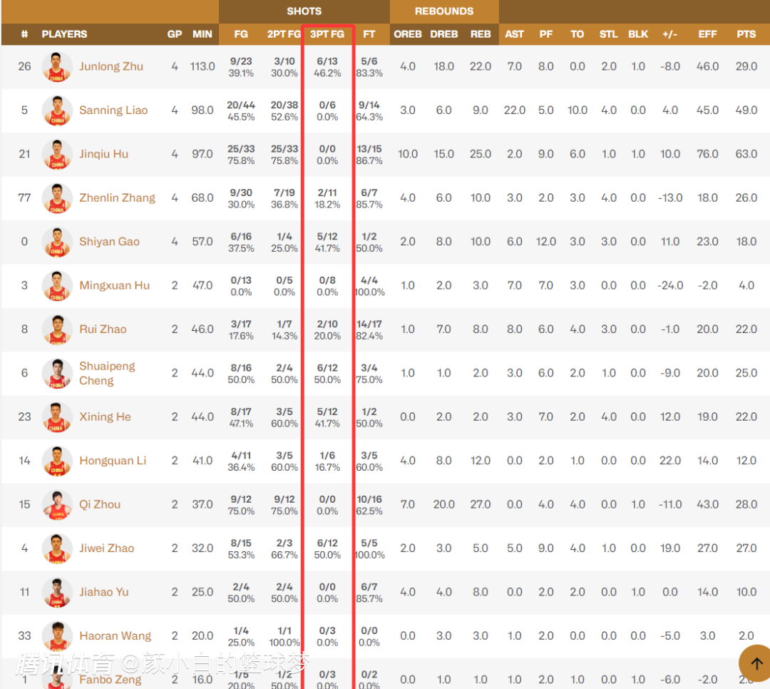 朱俊龙四场球三分13中6,程帅澎两场三分12中6,高诗岩4场三分12中5,贺希宁两场12中5,赵继伟两场12中6,这些球员都是三分投得非常出色的存在,可贺希宁与赵继伟两人不管是产量、命中率都在第一档。