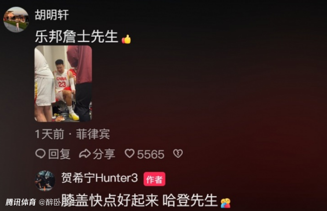 至于贺希宁则是留言回复胡明轩表示:“膝盖快点好起来,哈登先生。”贺希宁虽然是调侃胡明轩,但也是给出希望他快点好起来的期待。