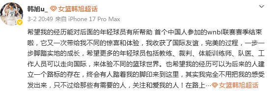韩旭则是前往了澳大利亚女篮联赛效力,同样是刚刚结束了联赛任务,接下来重返国家女篮并不意外。