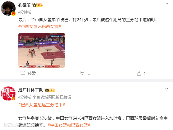 第四节,中国女篮单节只得到9分,被巴西轰出一波24-9进入加时。