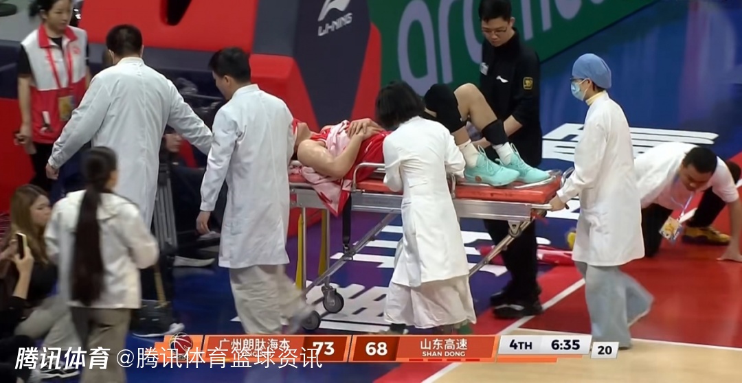 第四节比赛还剩下6分35秒的时候,郭艾伦持球突破,谢智杰想要完成封阻,而郭艾伦脚下一踉跄,直接倒地,随后他痛苦地捂着自己的膝盖,在地板上久久不起,之后被担架抬出场外。