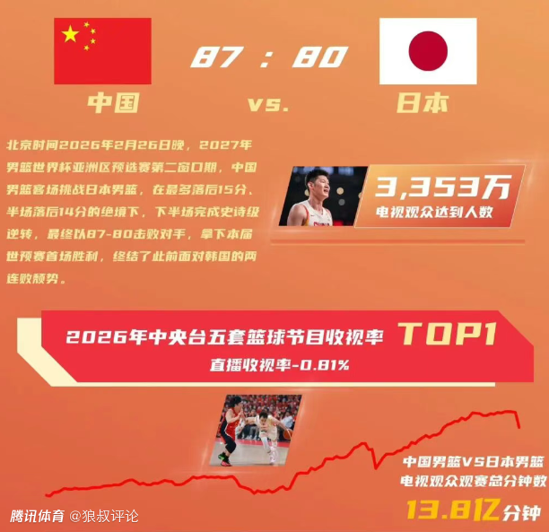 除了官方媒体大篇幅的报道、点赞与点评,我们还看到大家自发发布的社交媒体,剪辑的逆转名场面、球员高光瞬间,这些内容在各大平台的传播广泛。面对日本首战,5大平台产生54条相关热搜,热搜词条累计热度4.12亿;本场比赛的直播收视率0.81%,位列2026年中央台五套篮球节目收视率第一位;比赛电视观众达到人数3353万人,观赛总分钟数13.8亿分钟。