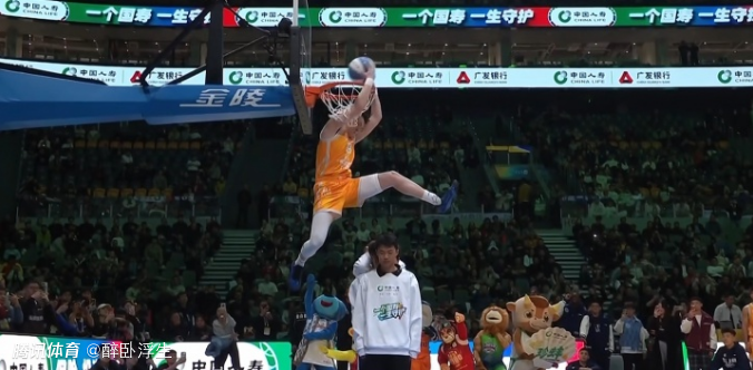 第5位出场的是四川球员刘冠杉,他尝试拉杆反扣连续两次失败,最后完成勉扣得到35分。