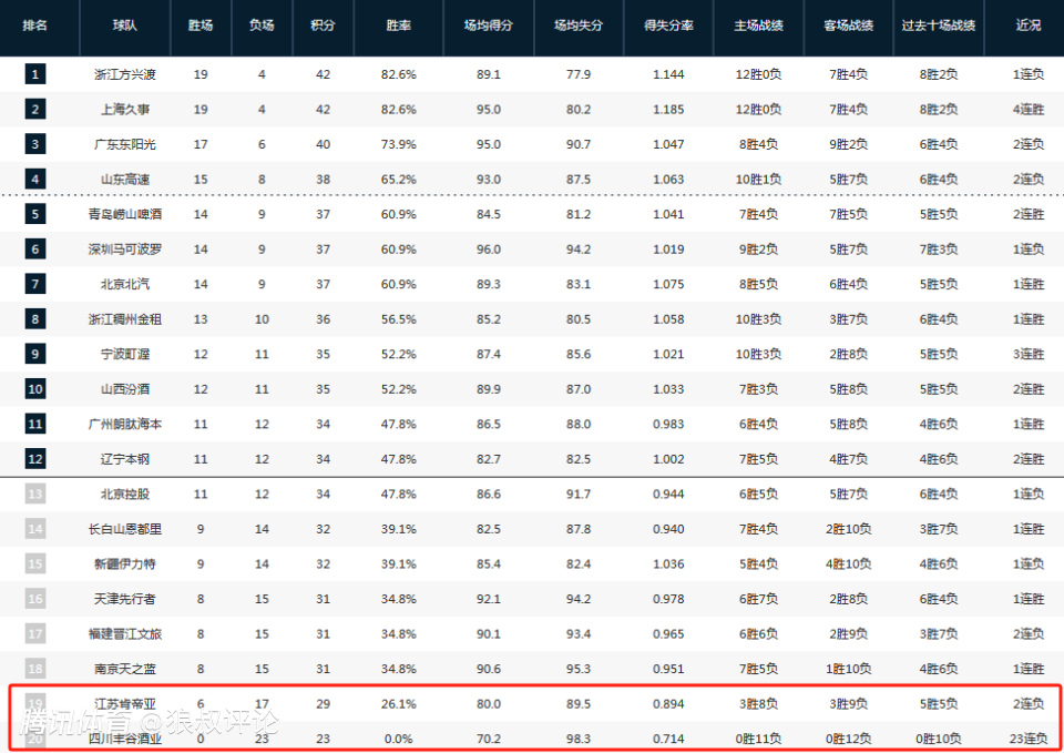 首先是危险的球队,四川目前处于末班车的位置,0胜23负的战绩肯定是历史倒数级别,而江苏以6胜17负排在倒数第二。