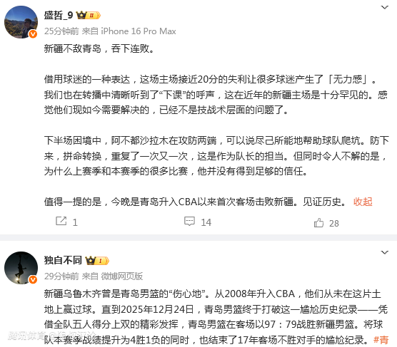 青岛男篮从2008年升入CBA,他们从未在新疆男篮主场赢过球。直到2025年12月24日,今晚终于打破这一尴尬历史纪录。