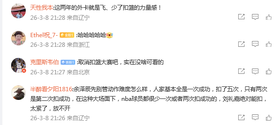 余泽辰先别管动作难度怎么样,人家基本全是一次成功,扣了五次,只有两次是第二次扣成功,在这种大场面下,nba球员都很少一次或者两次扣成功的,刘礼嘉绝对能扣,太紧了,放不开。