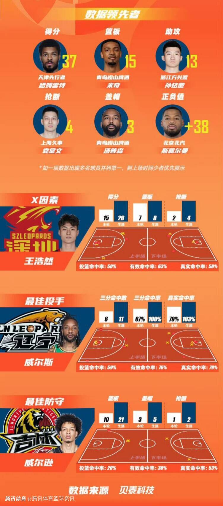 上海久事大鲨鱼官方微博球员袁堂文以单场4次抢断的数据领衔抢断榜;