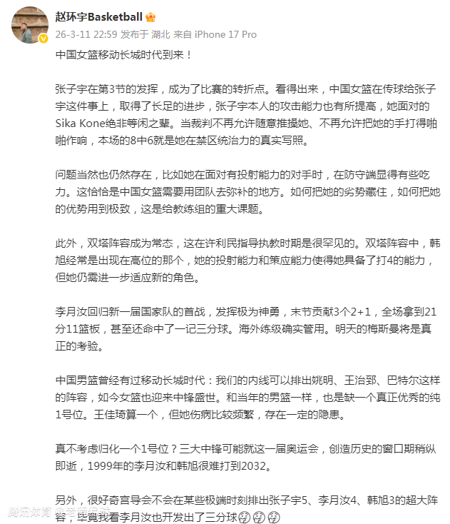2026年女篮世界杯预选赛上,中国女篮三大中锋李月汝、韩旭和张子宇一同出战,这也是“三大中锋”首次联手。媒体人赵环宇表示,鉴于李月汝和韩旭的年龄,三大中锋可能只能联手打一次奥运会,中国女篮应该考虑归化一个控卫。