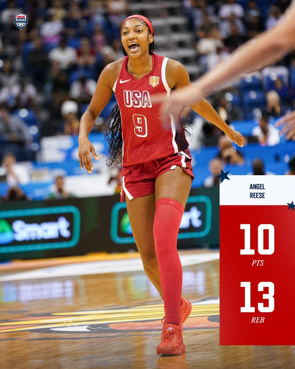 全场美国队在篮板(49比30)、助攻(27比11)、抢断(14比5)和盖帽(8比4)等多项数据上全面领先,第四节还剩57秒时一度以89:46领先43分,比分差距被彻底拉开。