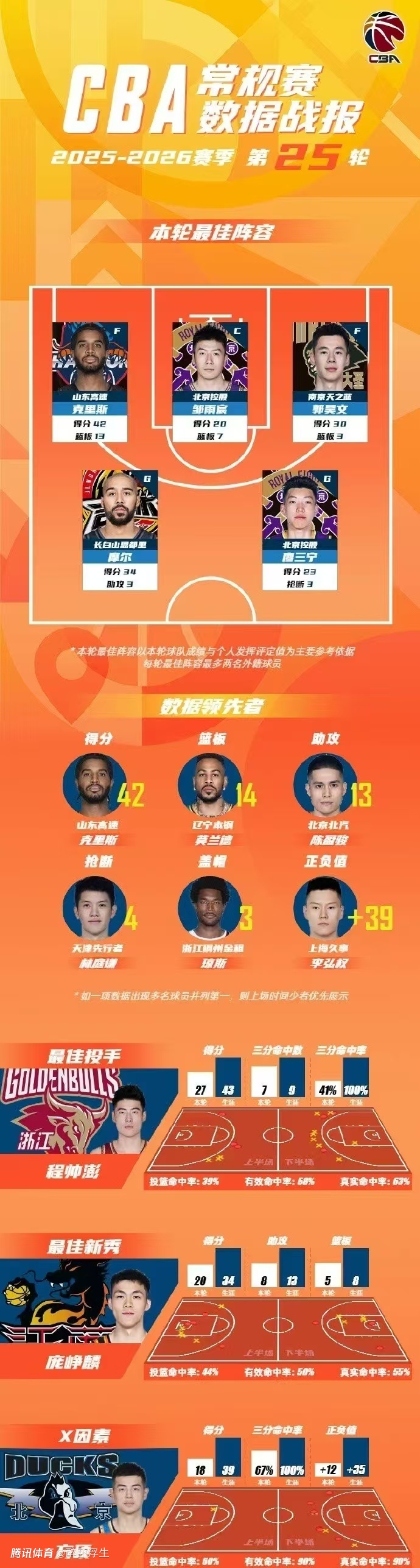 CBA官宣常规赛第25轮最佳阵容,北控双星20+7的邹雨宸与23分的廖三宁携手入选,克里斯轰下创CBA生涯新高的42+13率领山东赢下齐鲁德比,郭昊文轰下30分力压庞峥麟20+5+8赢下德比对决,外加摩尔34分率领吉林爆冷战胜新疆也入选。