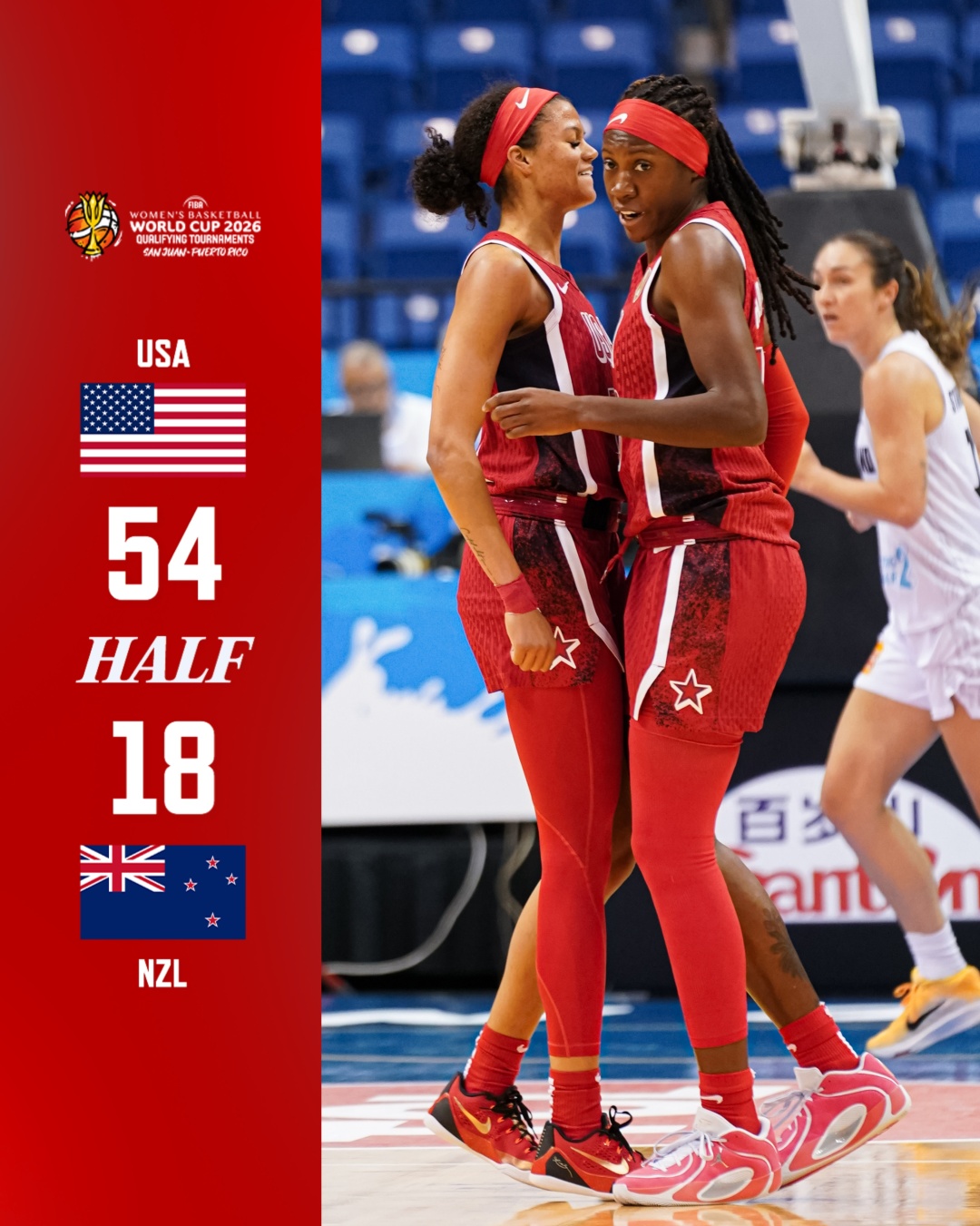 全场美国以101:46大胜55分,投篮命中率达到58.82%,远高于新西兰的31.15%,同时在助攻(29比10)、抢断(17比5)等团队数据上全面碾压对手。