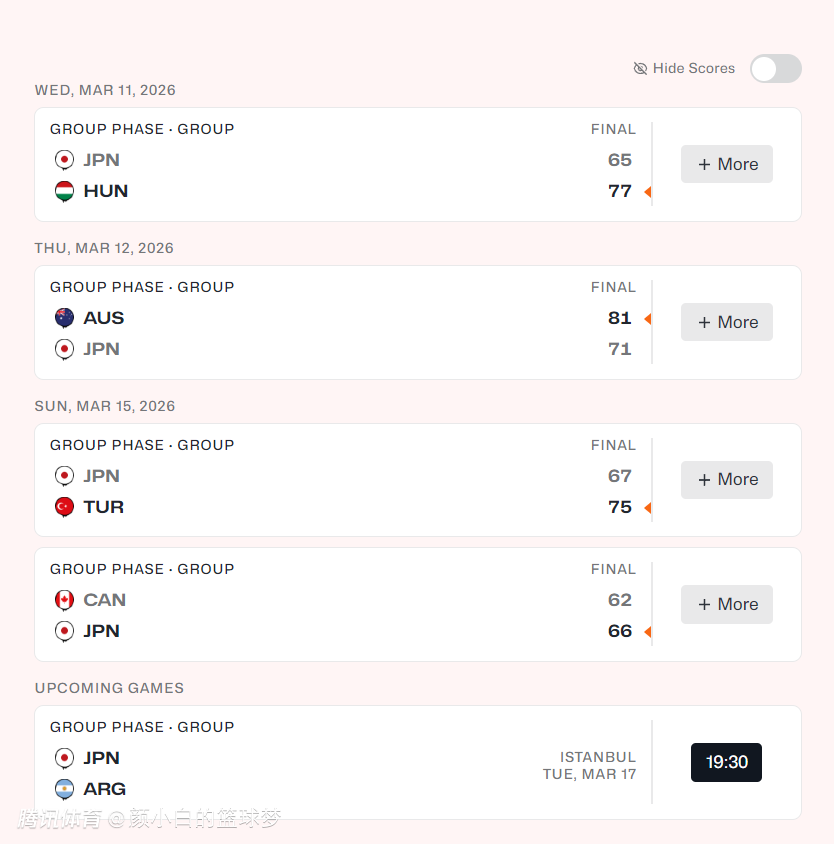 首战日本队65-77惨败匈牙利队、第二场日本队71-81惨败澳大利亚队、第三场日本67-75不敌土耳其队、第四场日本66-62险胜加拿大。换言之日本只剩下VS阿根廷一场比赛了。