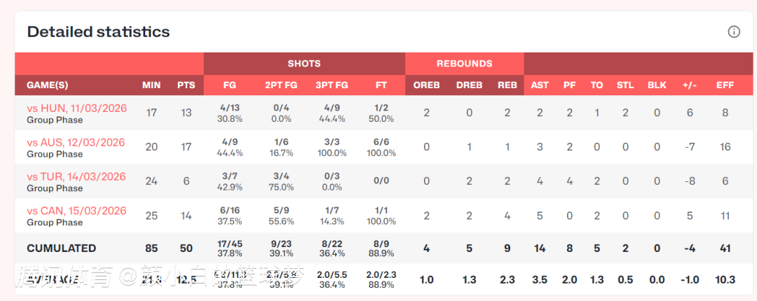 他四场比赛场均21.3分钟,拿到12.5分3.5助攻2.3篮板1.3失误0.5抢断,命中率37.8%,三分命中率36.4%,效率值非常低。