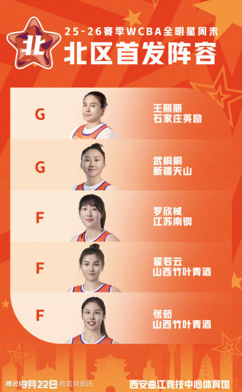 北区首发球员:王丽丽(石家庄英励)、武桐桐(新疆天山)、罗欣棫(江苏南钢)、翟若云(山西竹叶青酒)、张茹(山西竹叶青酒)。