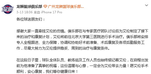 感谢大家一直牵挂艾伦的伤情。俱乐部在与专家医疗团队讨论后为艾伦制定了接下来的治疗和康复计划,艾伦将前往北京大学第三医院进行手术治疗。俱乐部将安排专人全程跟进、全力保障,协调和协助好术前准备、术后康复及各项后勤服务工作,尽最大努力为艾伦提供稳妥、周到的治疗与康复条件。